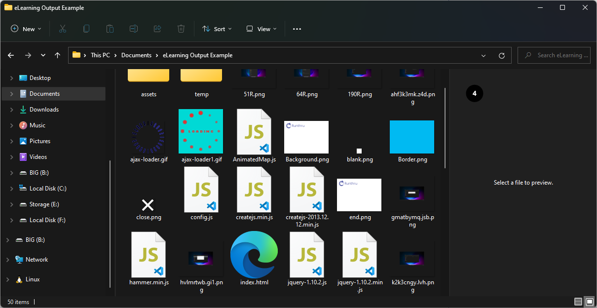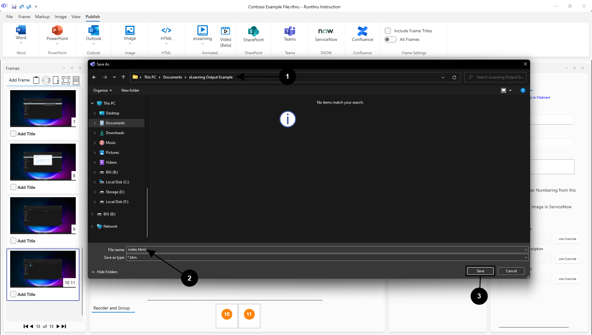 We recommend choosing an empty folder as where you save the html file, Runthru Instruction will also generate and save a range of supporting files required for eLearning to work in the same folder