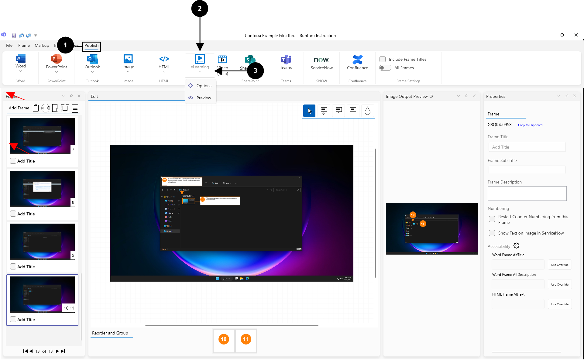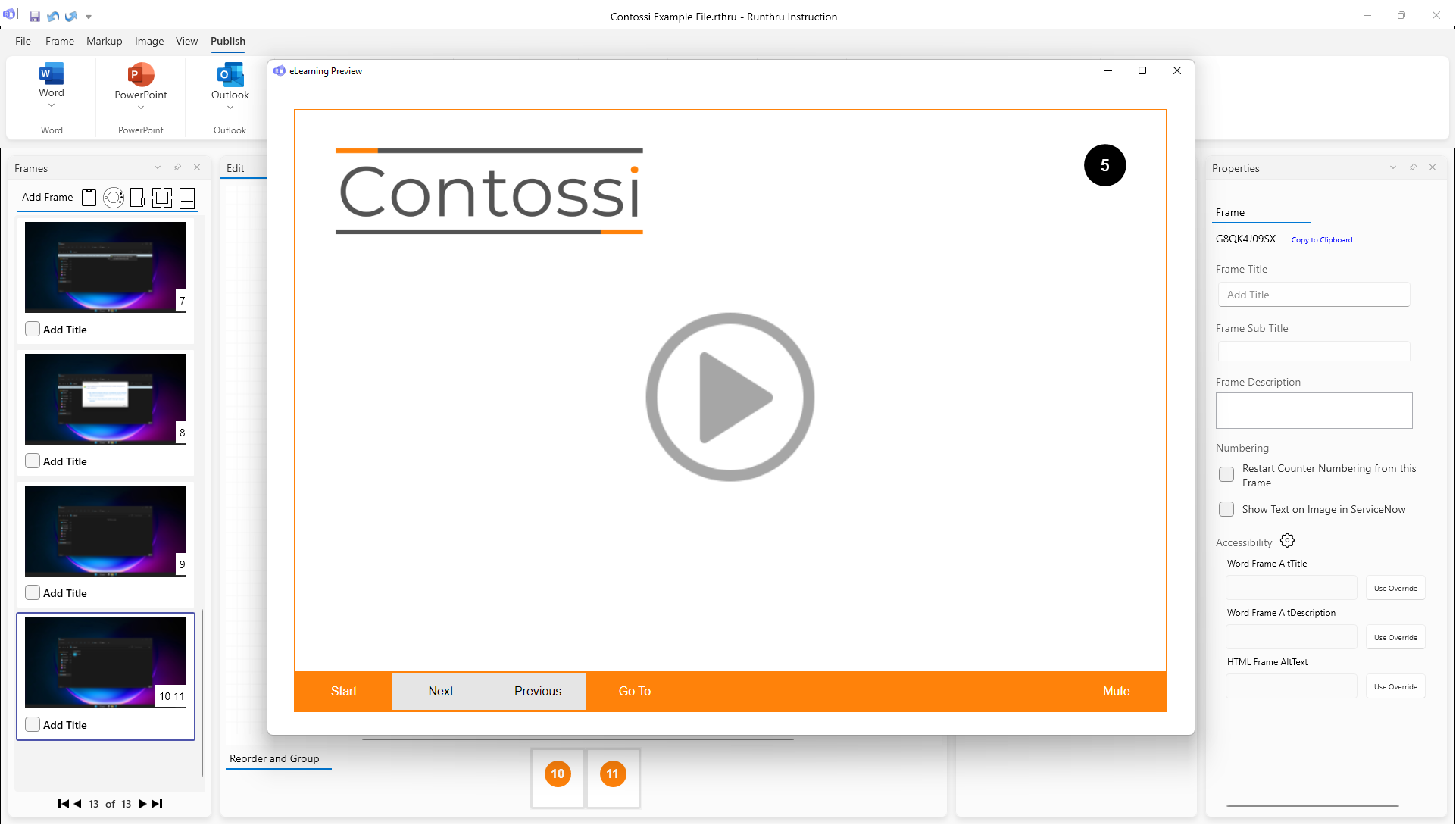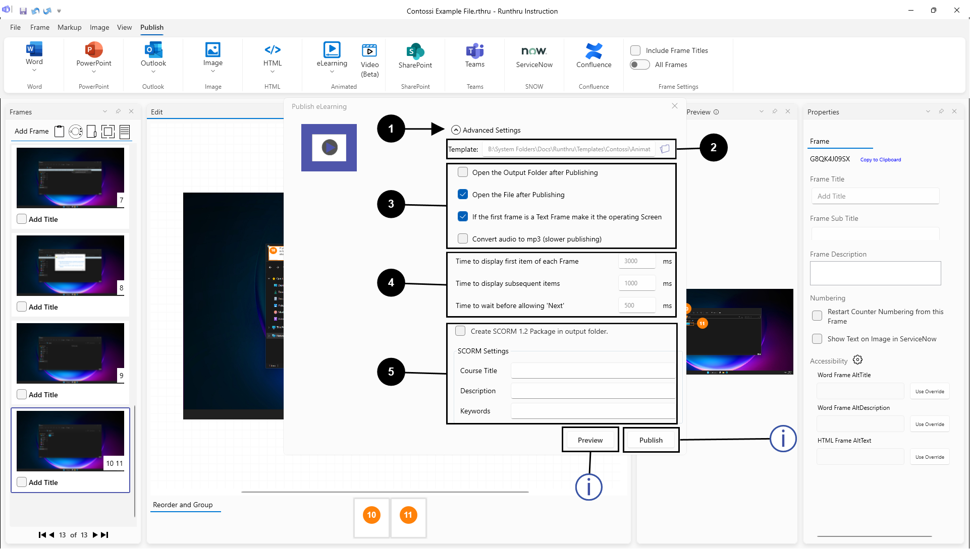 Preview opens a window that publishes and embeds the eLearning so you can review it quickly in Runthru Instruction. Please see the Preview section below for more information.