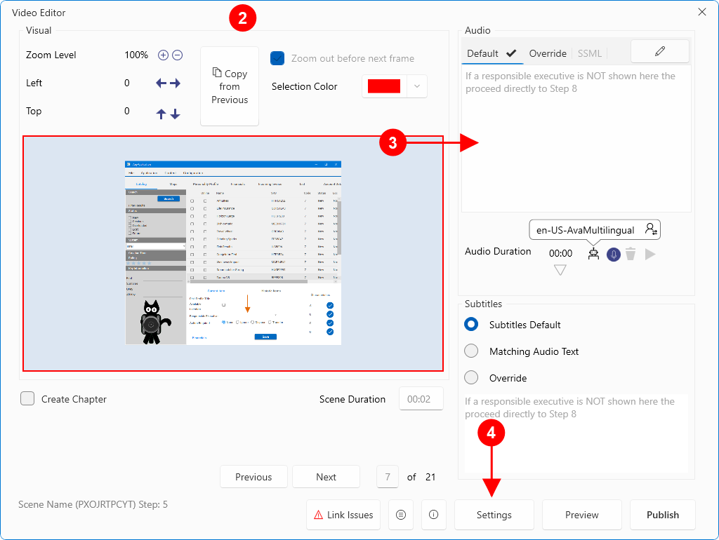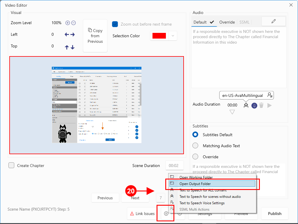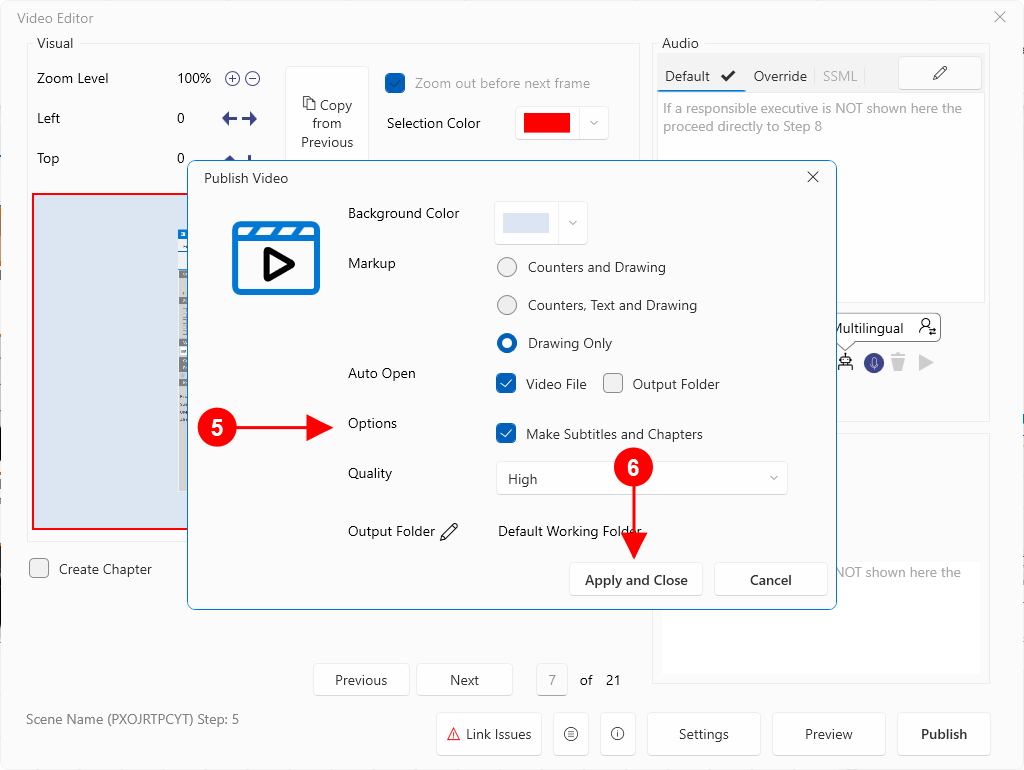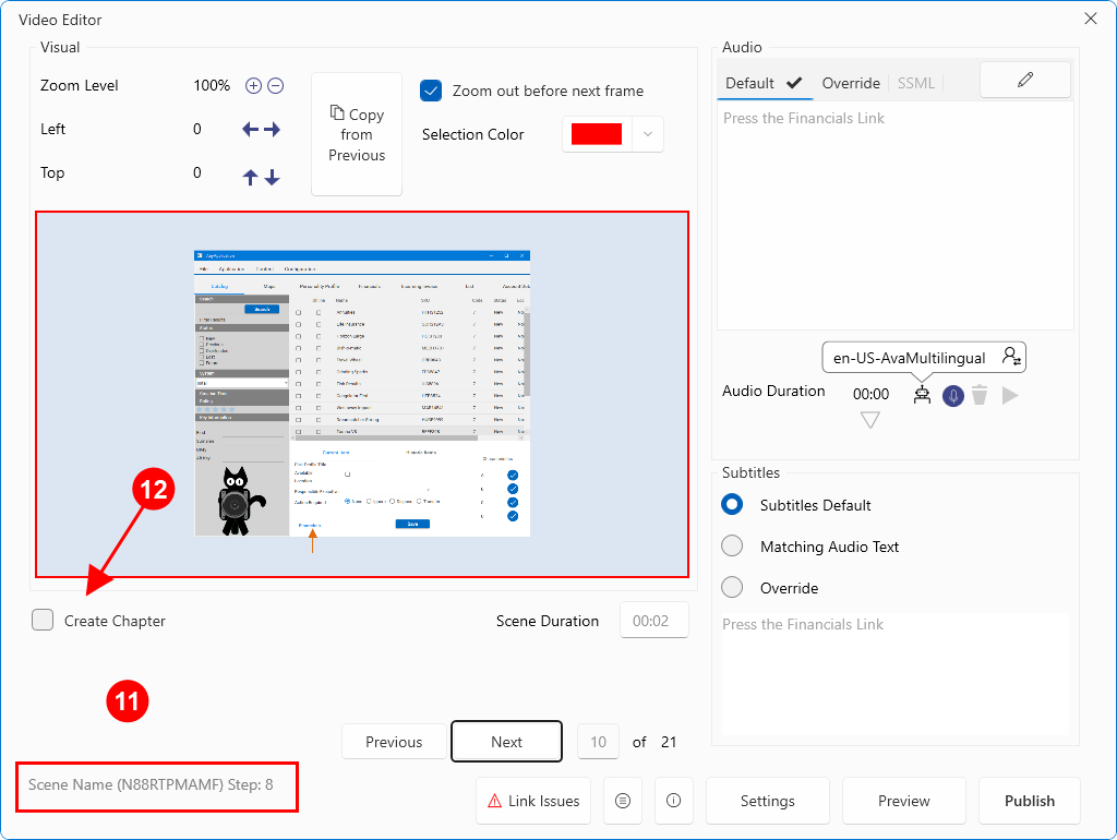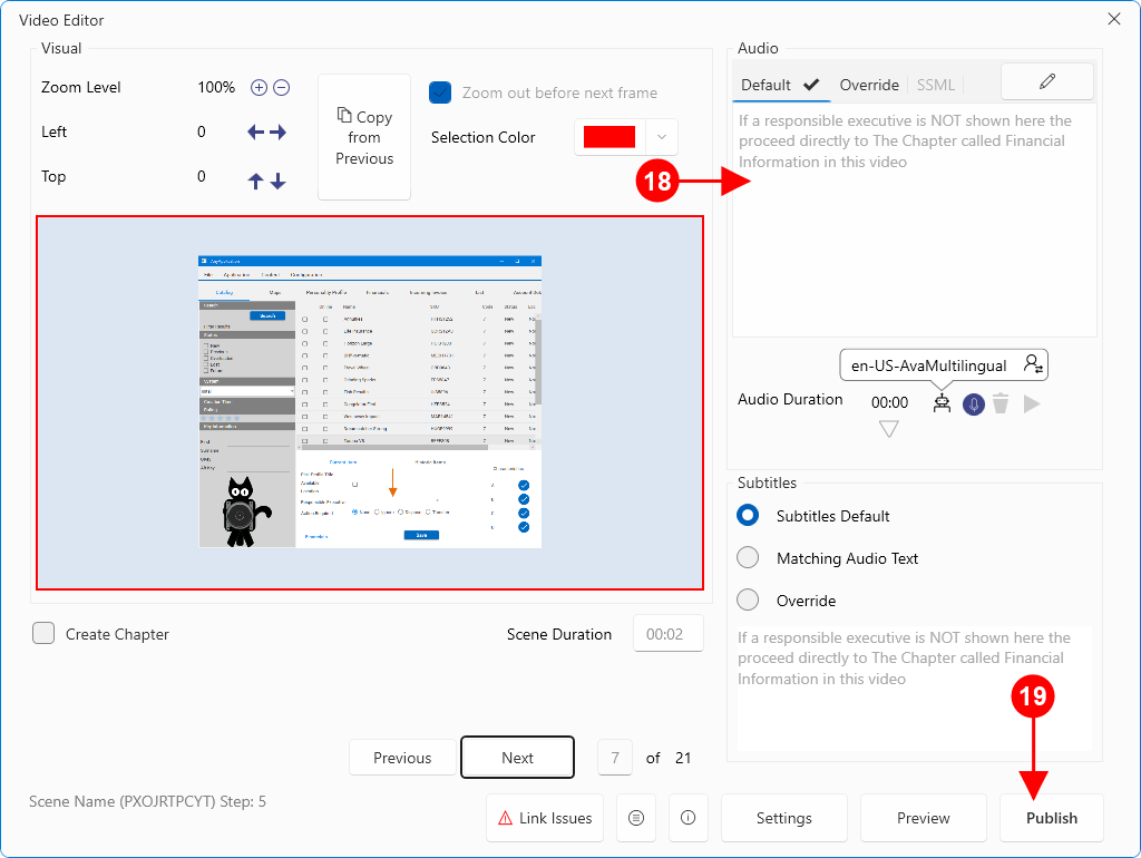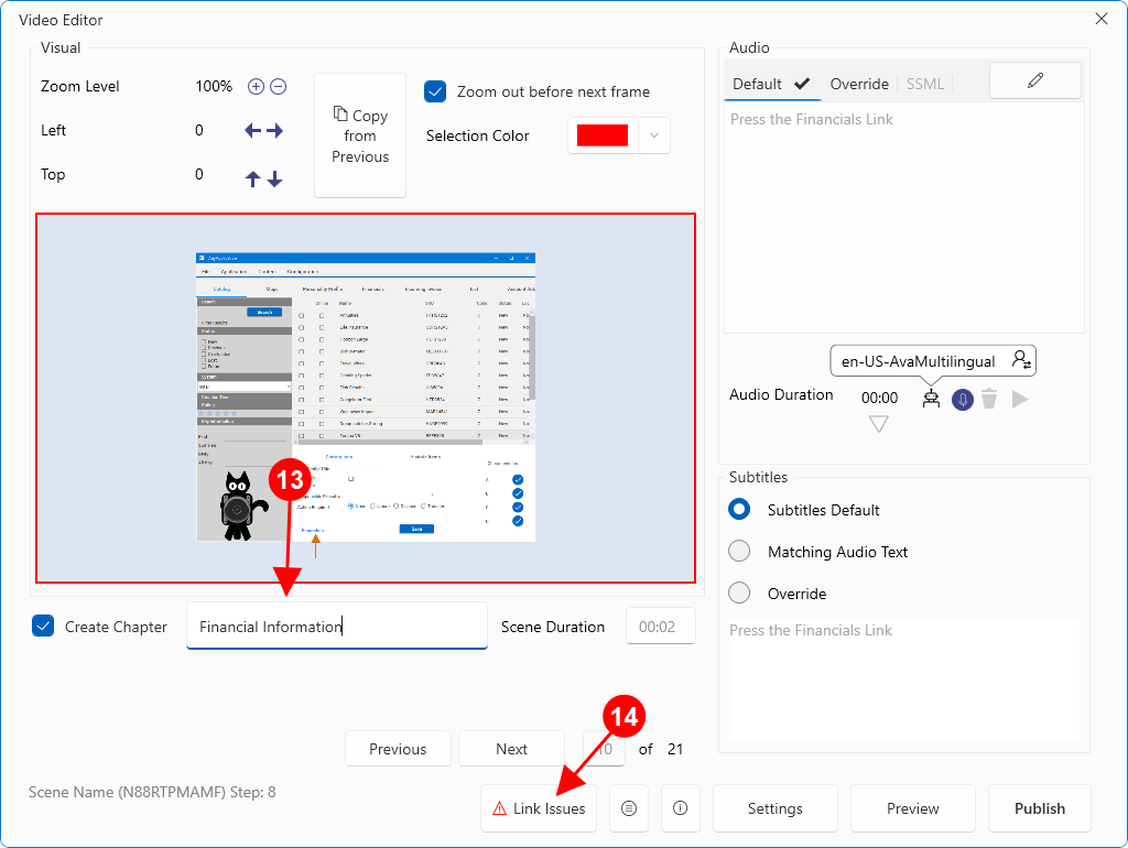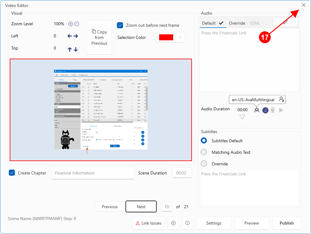 On reopening the video window and navigating to Step 5, the text now directs the user to navigate to the chapter called Financial Information. When published, a text file will be produced that can be uploaded to your video hosting service. It will act like a table of contents for your video.