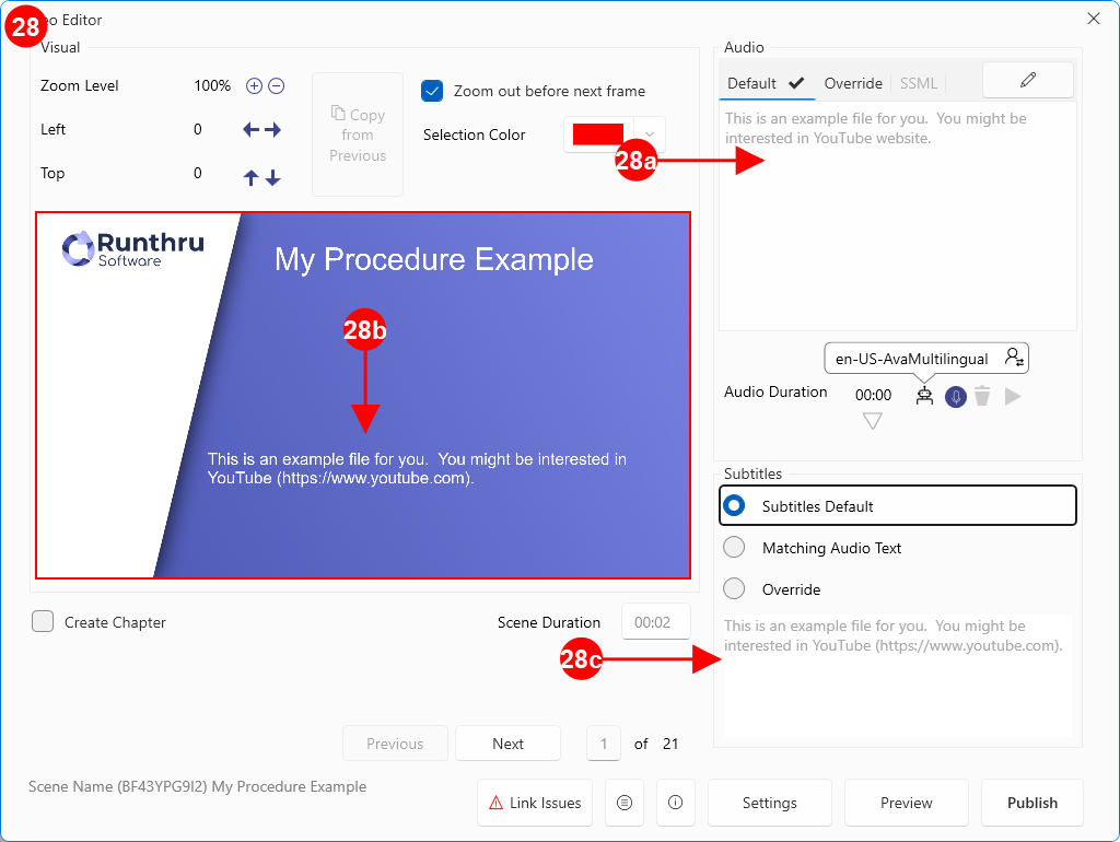 The subtitles section uses the same text as shown on the video screen. It will be included in the subtitles file that can be uploaded to your video hosting service where it can be displayed to the viewer of the video.