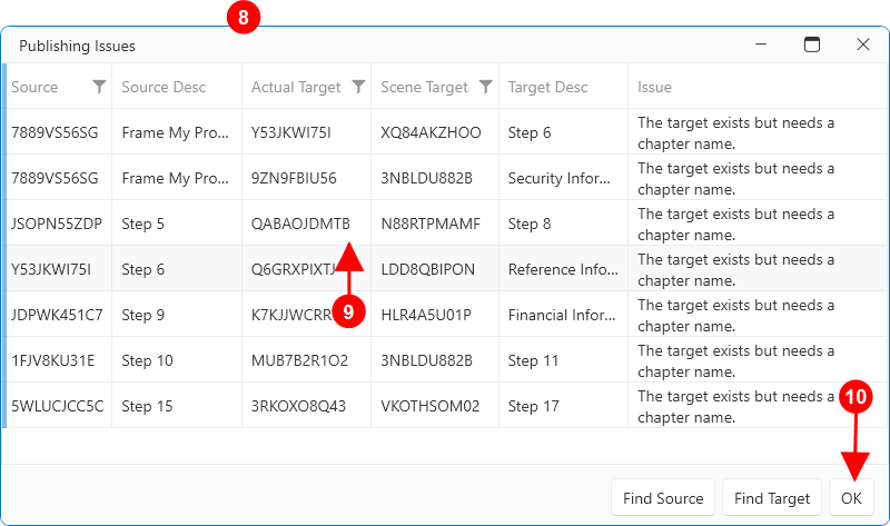 We'll continue with the Step 5 to Step 8 example. The issue is that the target exists, but there is no chapter name. We'll now add a chapter name for Step 8.