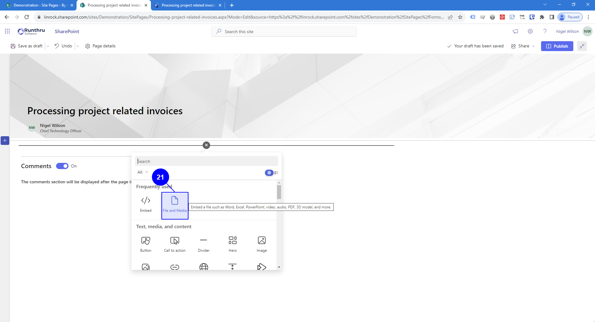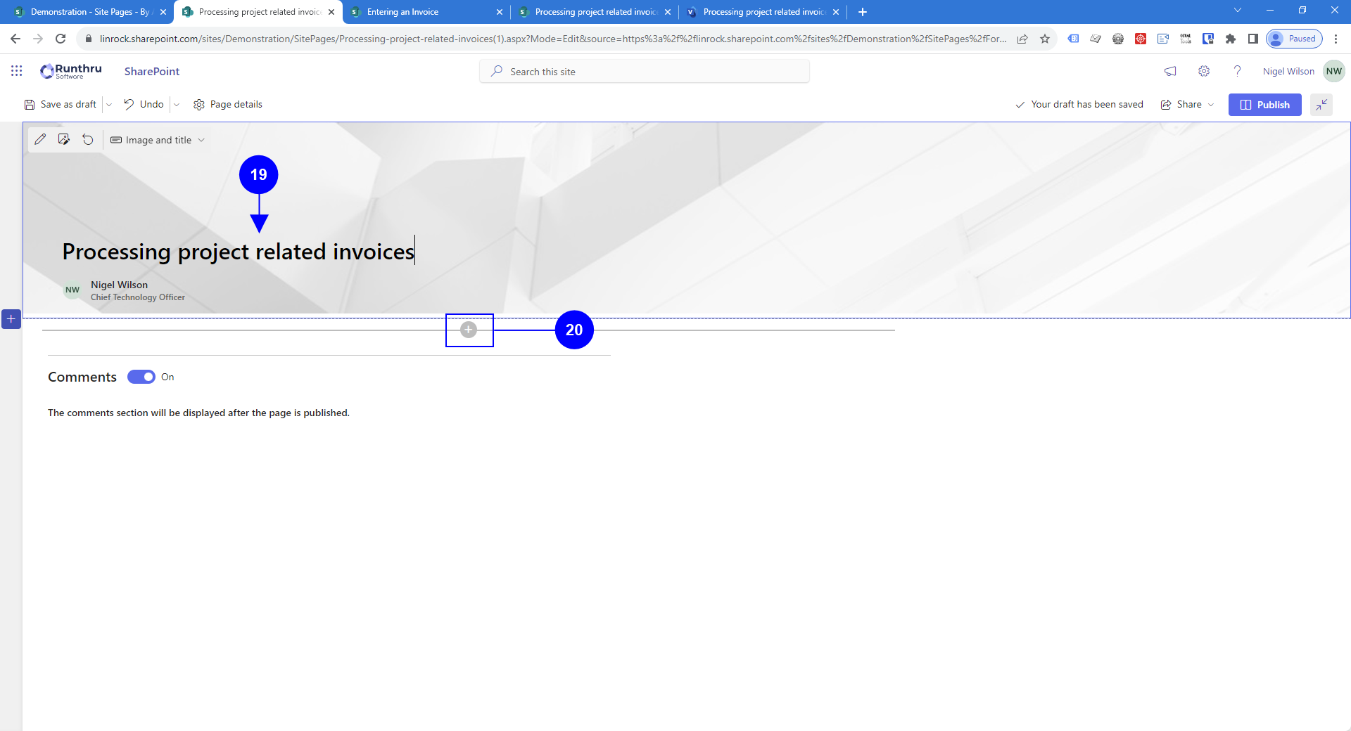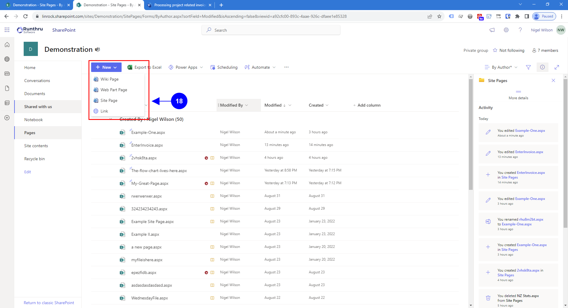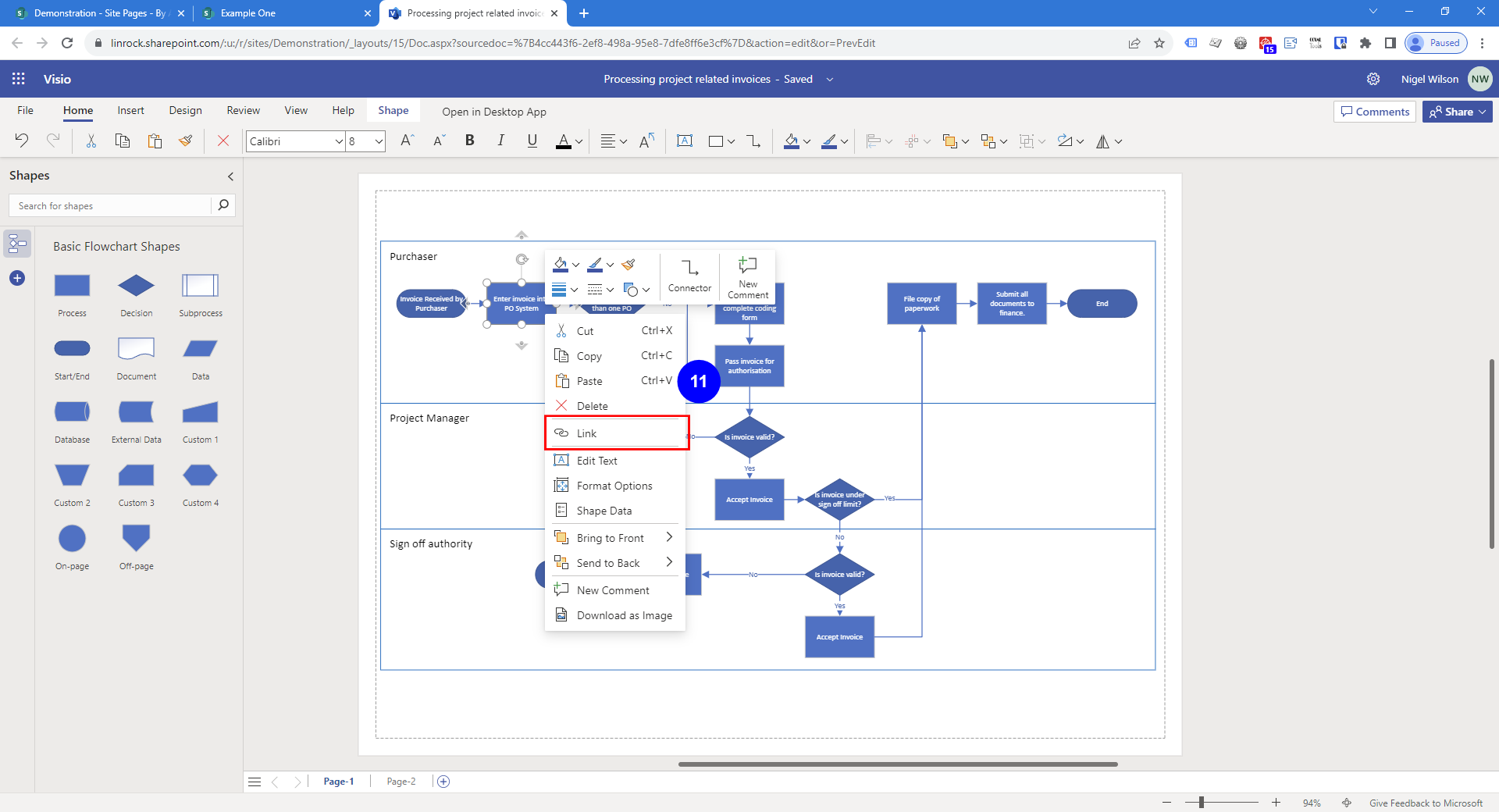 Returning to SharePoint we'll now create a new page. Into that page we will add our visio flowchart that includes the new link.