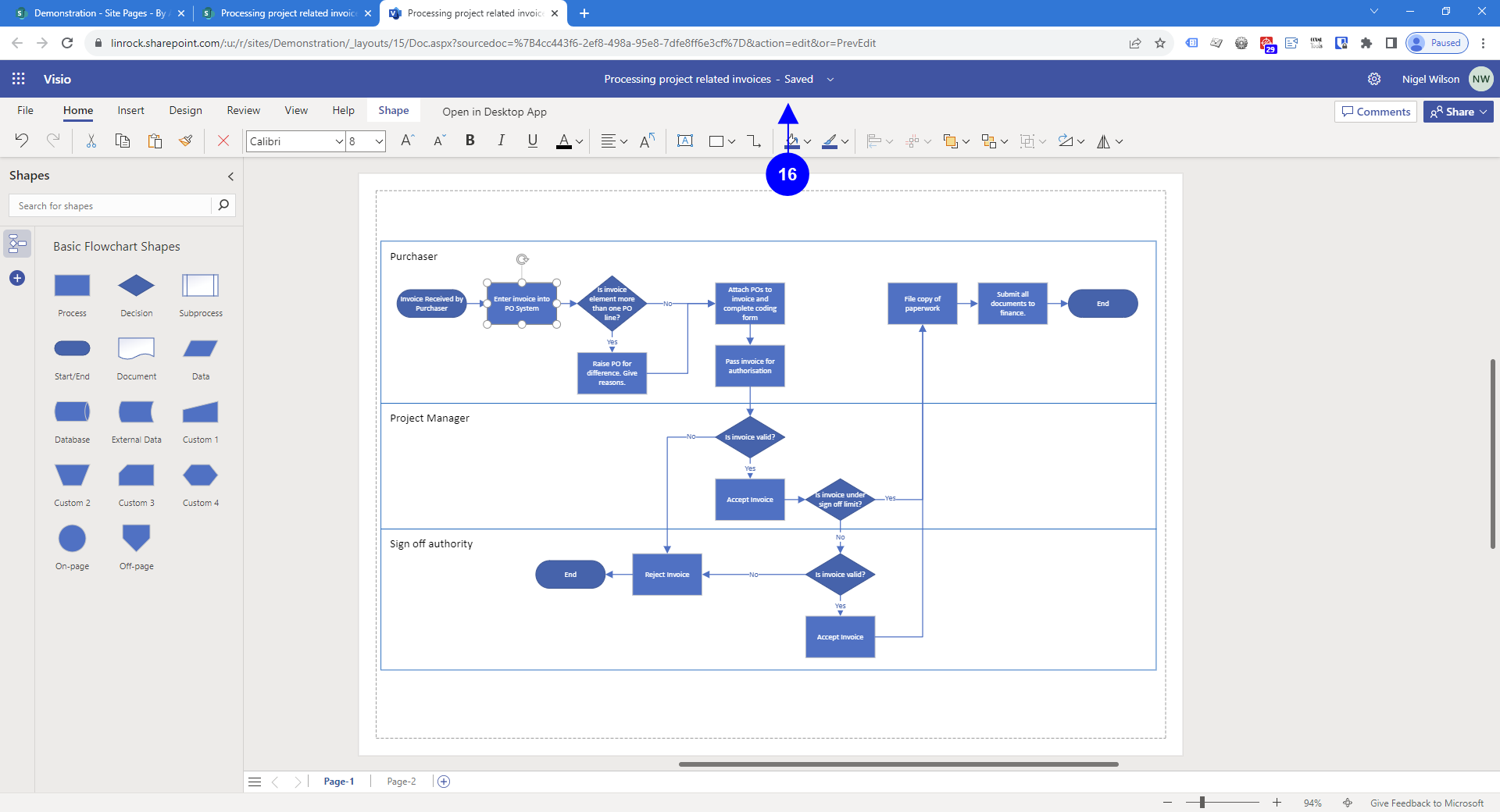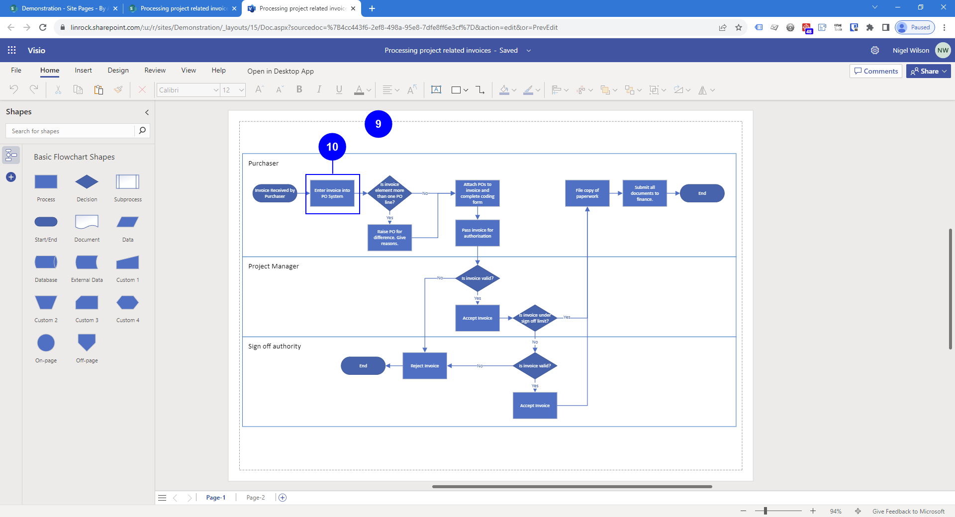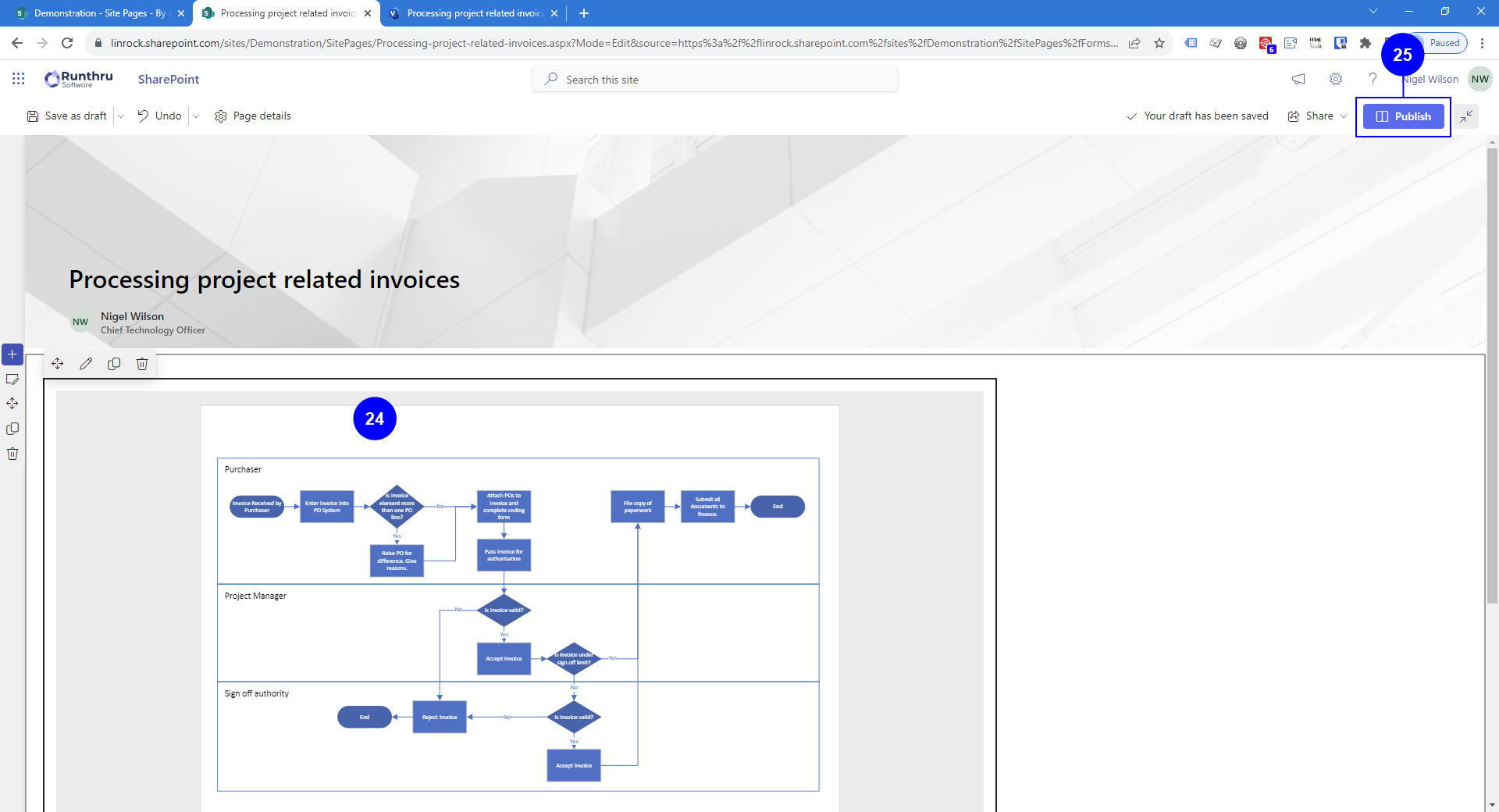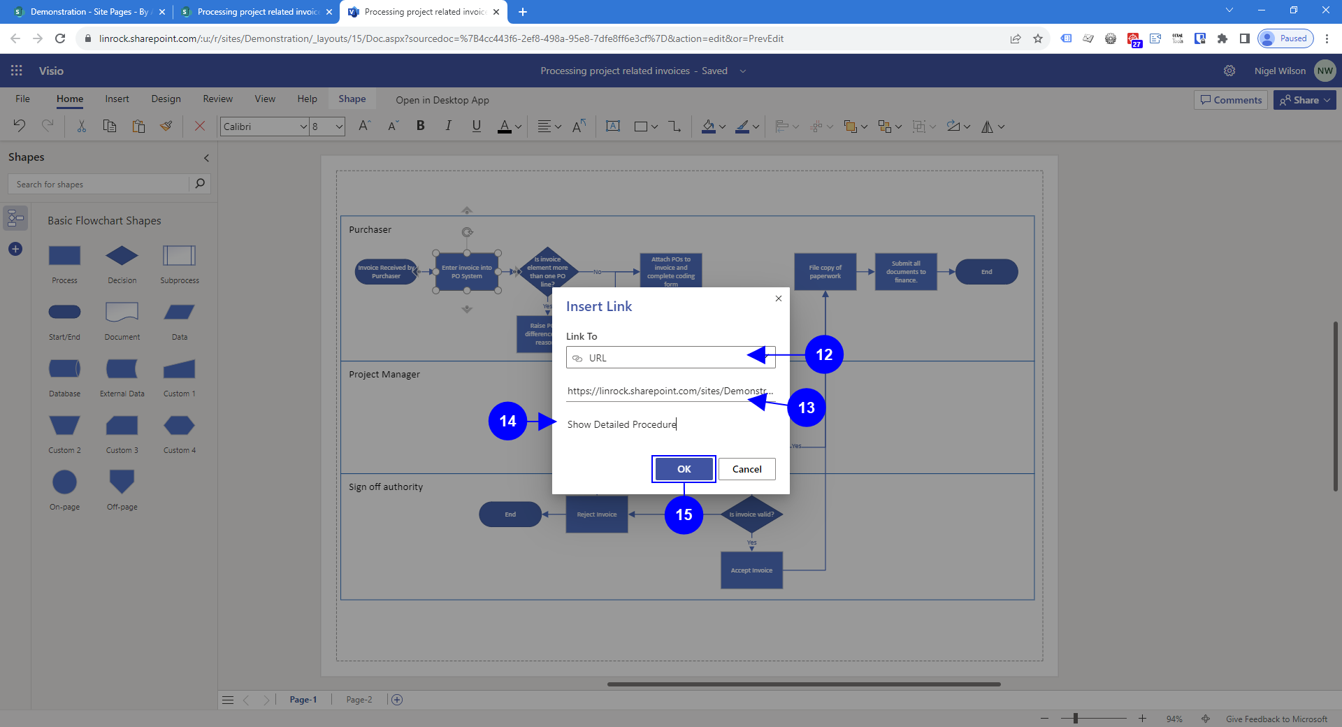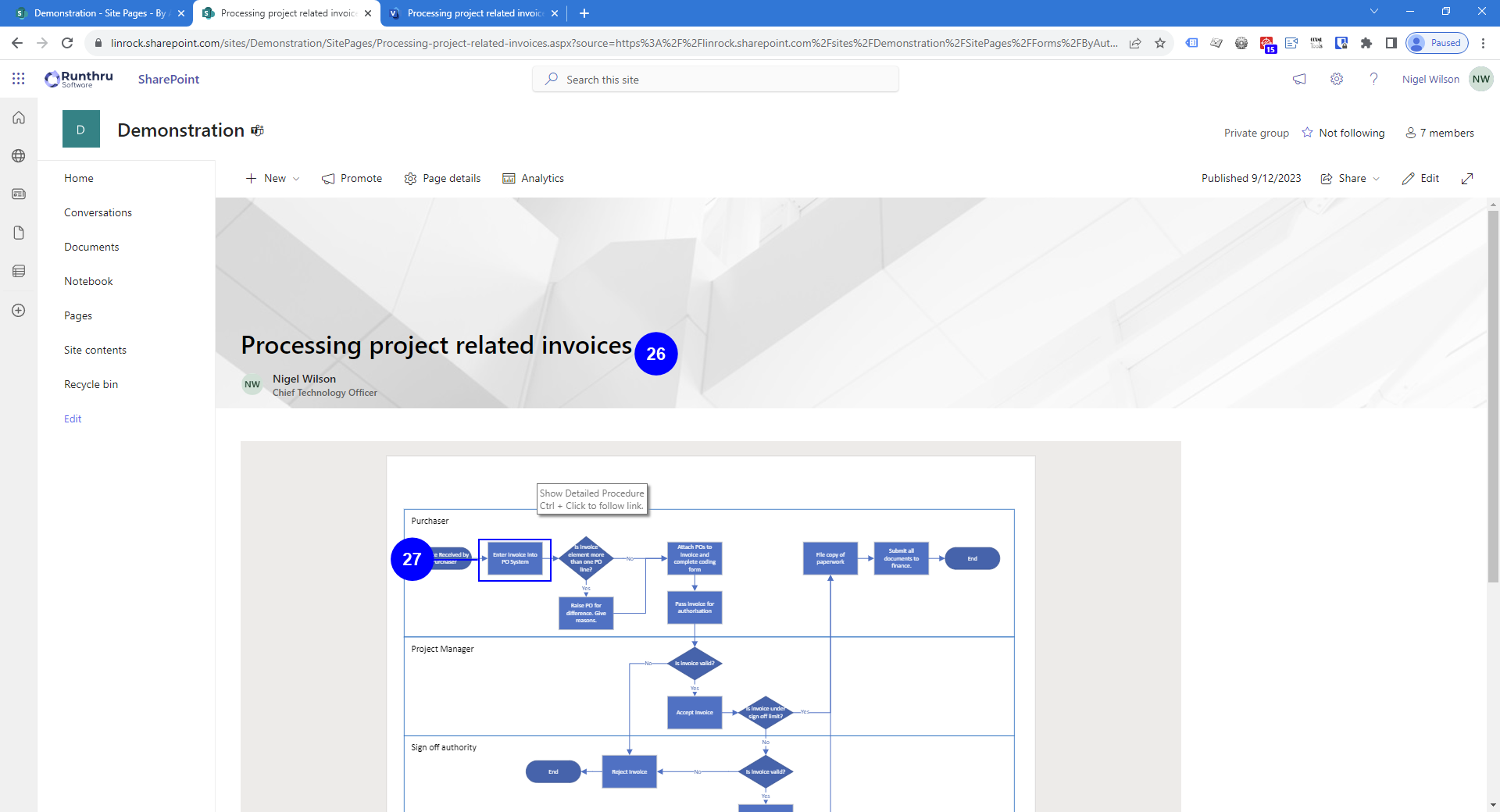 Using a Runthru Instruction file we published a clear instructional procedure, to SharePoint. We then added a link to that procedure to a step in Visio. That Visio file was then included in a SharePoint page. The result being a process flowchart, with a step linked to a detailed procedure.