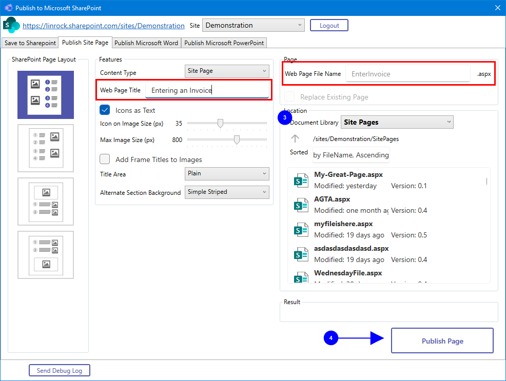Pressing the SharePoint publishing button, displays the SharePoint publishing options.